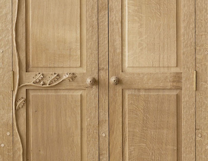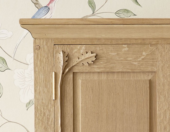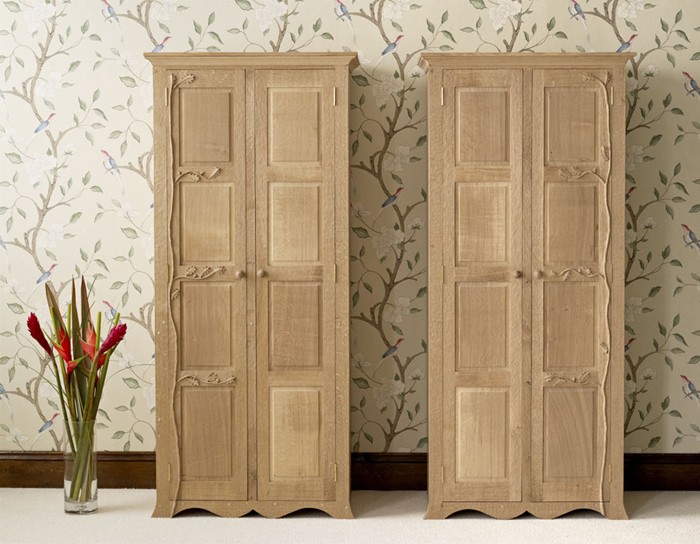 Twin wardrobes with oak leaves hand carved from solid oak. A bespoke design in a light oak finish for a client with an Arts and Crafts house. These are now part of our oak bedroom furniture range.
