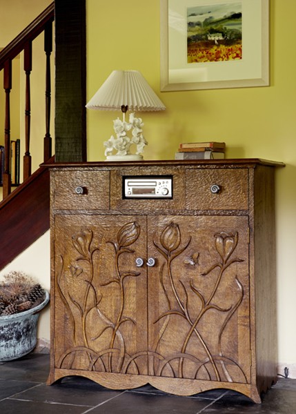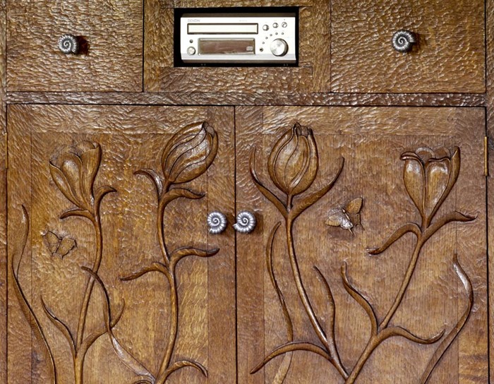 This is a handmade oak cabinet with hand carved flowers and butterflies. This particular client had requested a bespoke oak cabinet design to allow his audio equipment to be on display. A similar design can be viewed on the doors of some of our oak bedroom furniture.