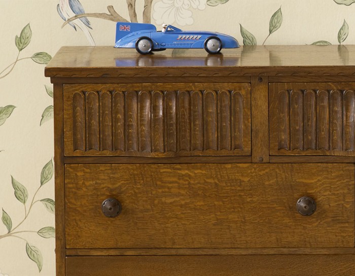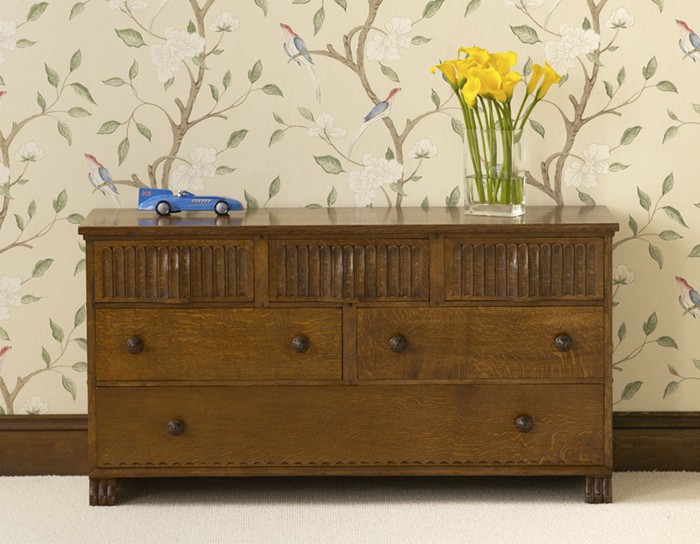 An essential item of oak bedroom furniture in oak. This chest of drawers has an exceptionally long handmade oak drawer at the bottom and our unique oak eyebrow handles on the top three handmade oak drawers. Again this furniture is made throughout in solid oak.