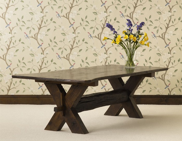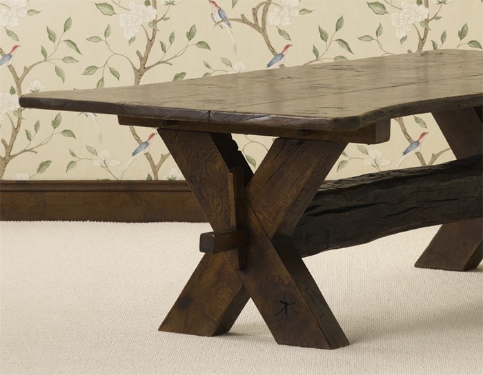 Cross ended oak refectory table. This was originally designed for a Norwegian customer who wanted it made using the same craftsmen techniques as in medieval times. The solid oak beam below the table is therefore shaped with an adze, while the table top follows the natural growth of the oak tree.