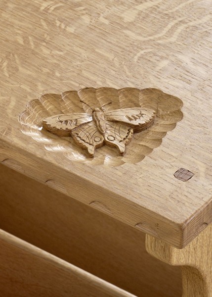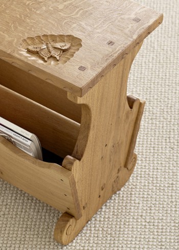 Magazine rack with a butterfly hand carved on the corner of the oak top. This piece is equally useful as a stool or simply a small table to complement our bedroom furniture.